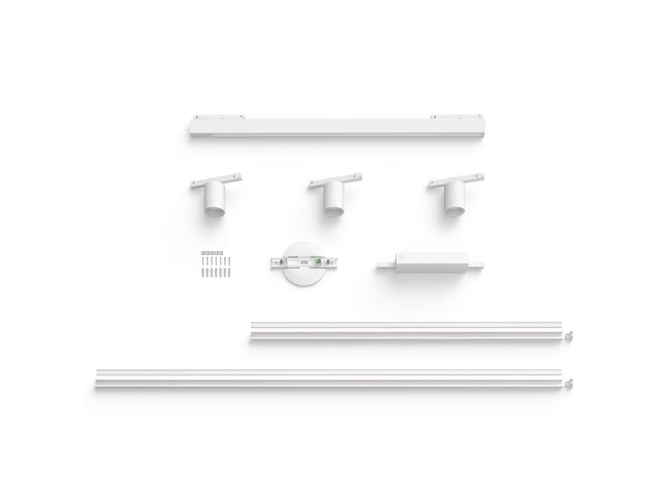 Zestaw ściennego oświetlenia szynowego w kolorze białym zawiera trzy cylindryczne reflektory, szynę o długości 1 metra, szynę o długości 0,5 metra, złącze proste i zasilacz umieszczony na końcu jednej szyny z wtyczką.