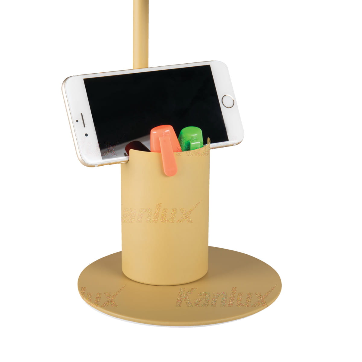 Kanlux RAIBO to modna retro lampka biurkowa. Dostępna jest w 4 pastelowych kolorach, jak i w popularnej czerni i bieli. W podstawie wbudowany jest organizer z uchwytem, w który możemy odłożyć telefon, długopisy czy okulary. Duży klosz, w którym zmieścimy żarówkę o trzonku E27 to szeroki rozsył światła. Widoczny jest tu wpływ retro, ale również dbałość o szczegóły i solidne wykonanie (stal). Zwróciliśmy też uwagę na spód lampki i dodaliśmy piankową podkładkę, aby lampka nie rysowała biurka.