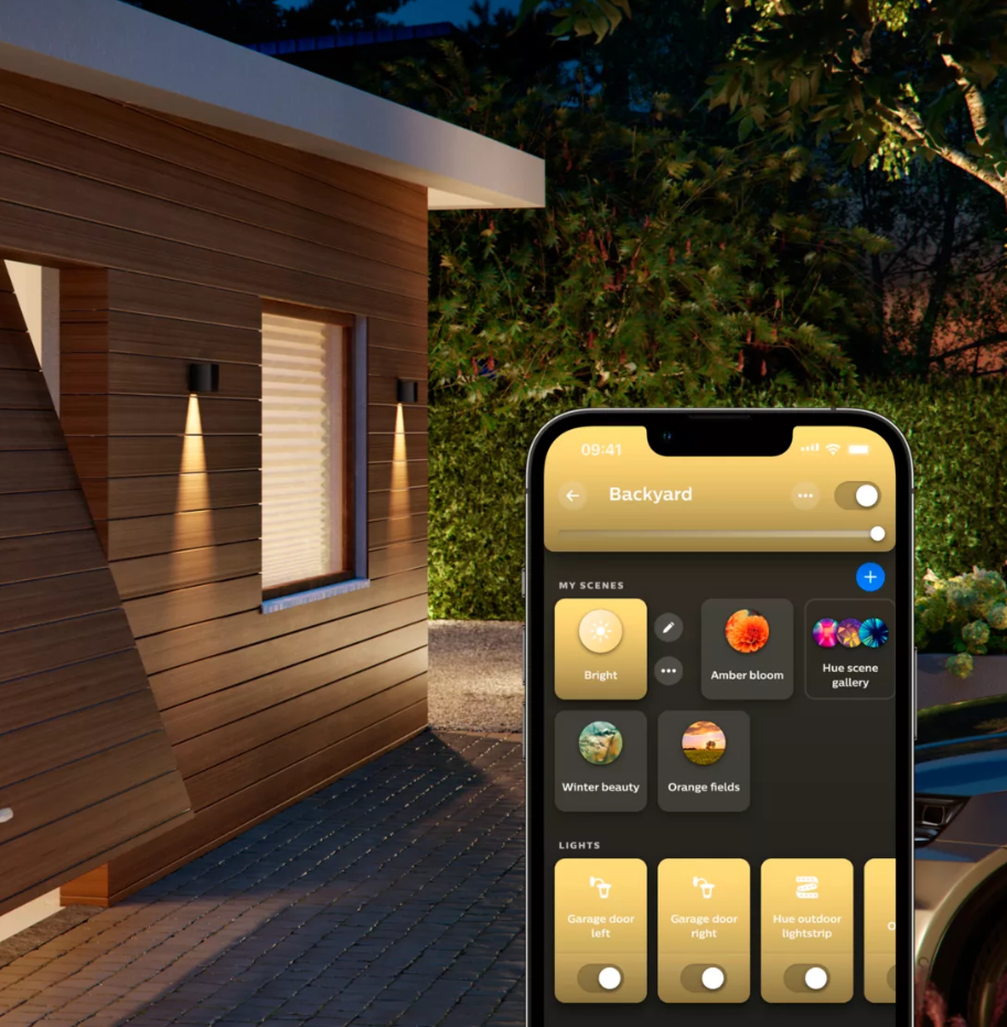 Podłącz swoje lampy ogrodowe do mostka Philips Hue i steruj swoim oświetleniem zdalnie (za pomocą aplikacji mobilnej, przenośnych sterowników i regulatorow światła czy głosowo).