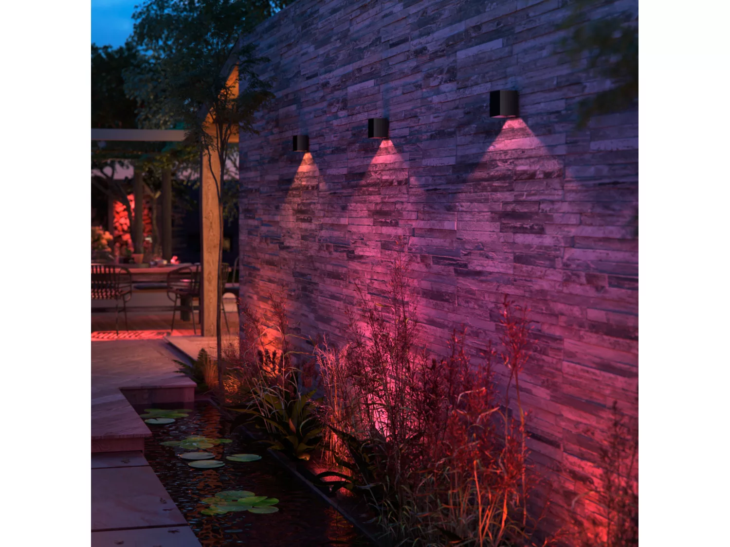 Ta oprawa do stosowania na zewnątrz Philips Hue została specjalnie zaprojektowana pod kątem wilgotnych miejsc i przeszła rygorystyczne testy, które potwierdziły jej właściwości. Stopień ochrony IP określany jest przez dwie liczby: pierwsza to stopień ochrony przeciw wnikaniu ciał stałych, a druga – przeciw wnikaniu wody. Klasyfikacja IP44 oznacza odporność na bryzganie wody z dowolnego kierunku. To najbardziej popularny produkt, który doskonale nadaje się do zastosowań zewnętrznych.