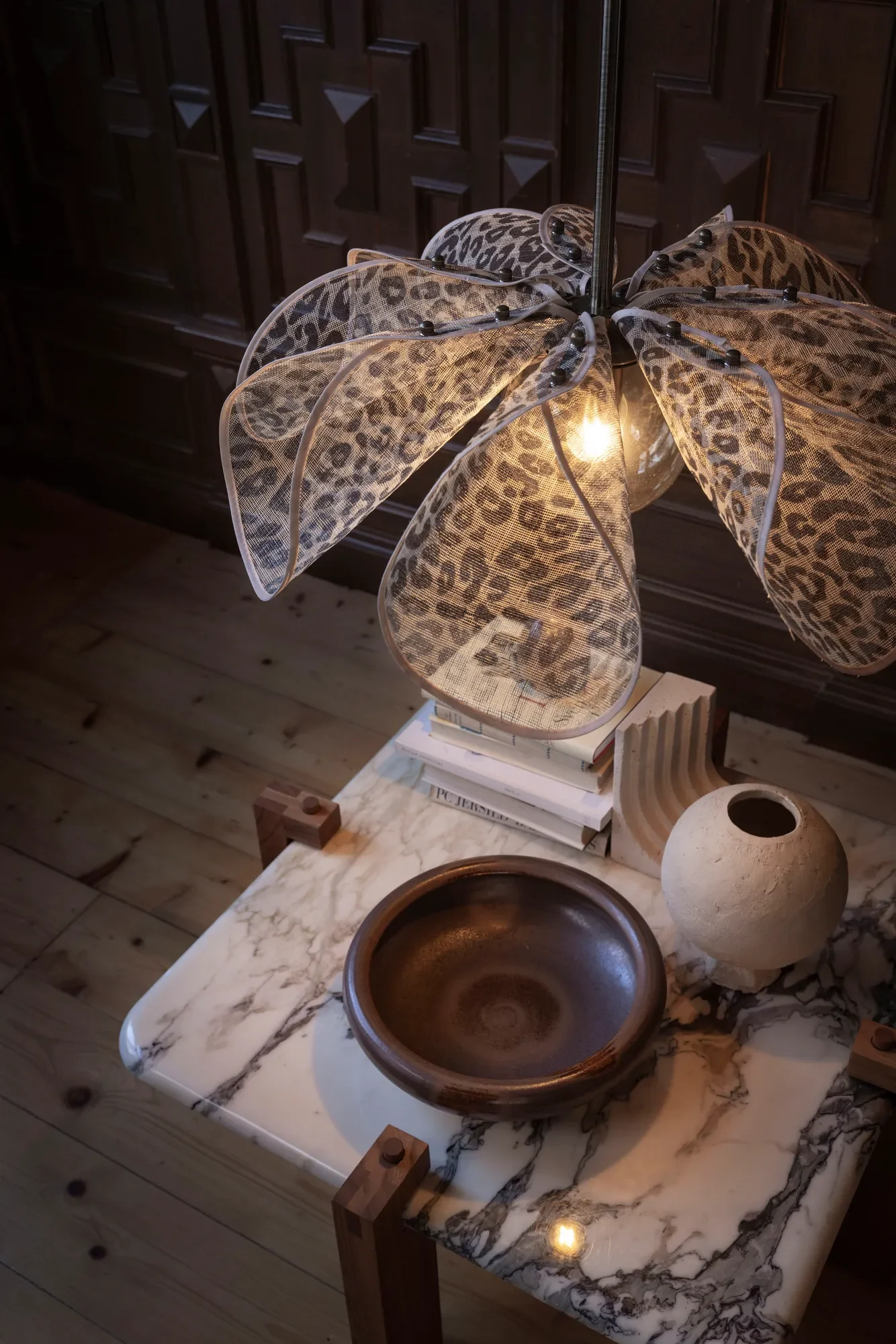 Lampa sufitowa w kształcie kwiatu z motywem panterki w unikalnym designie. Zaprojektowana przez Anja Pärson i Filippa Rådin.