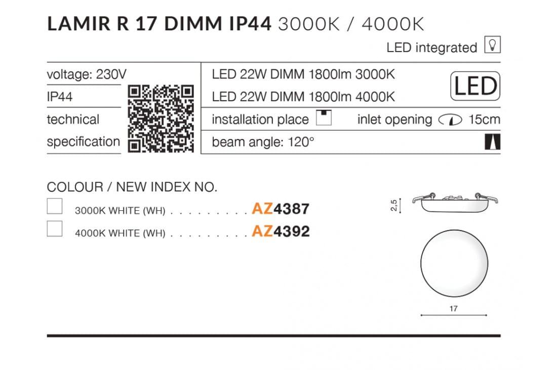 == WYSYŁKA 48H == AZ4392 LAMIR R17 DIMM IP44 4000K 1800lm OCZKO LAMPA WPUSZCZANA AZZARDO DO ŁAZIENKI