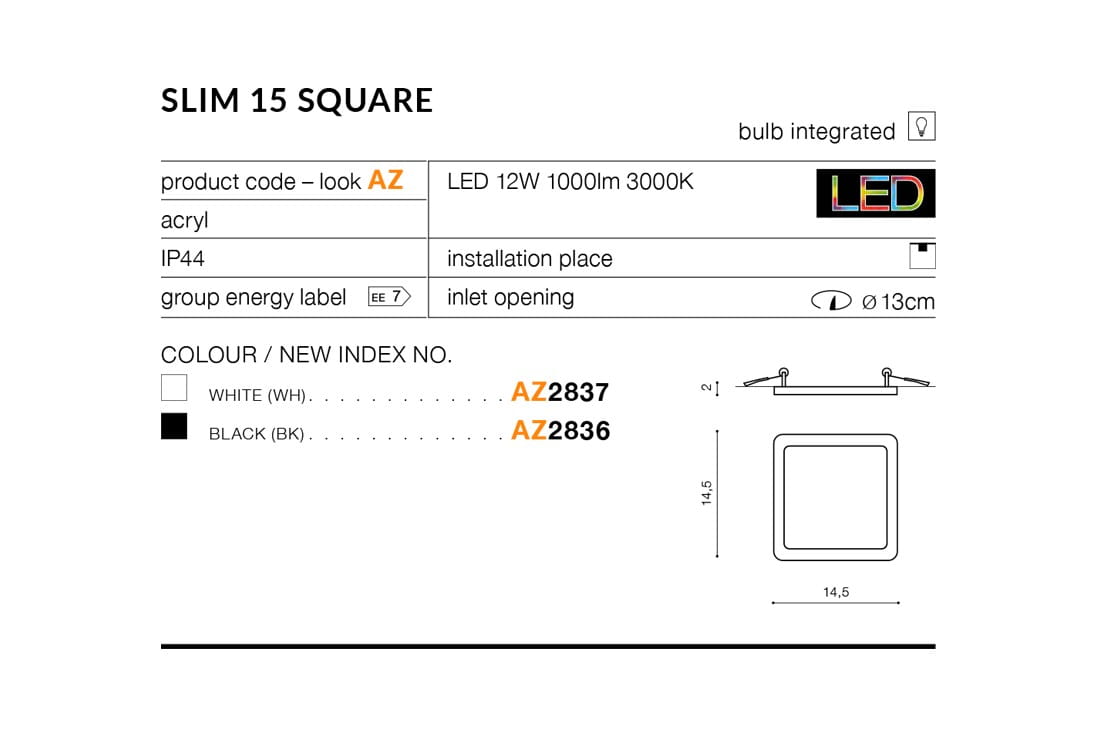 == WYSYŁKA 48H== SLIM 15 SQUARE BIAŁY AZ2837 1000lm 3000K LAMPA OCZKO WPUSZCZANE IP44 DO ŁAZIENKI AZZARDO