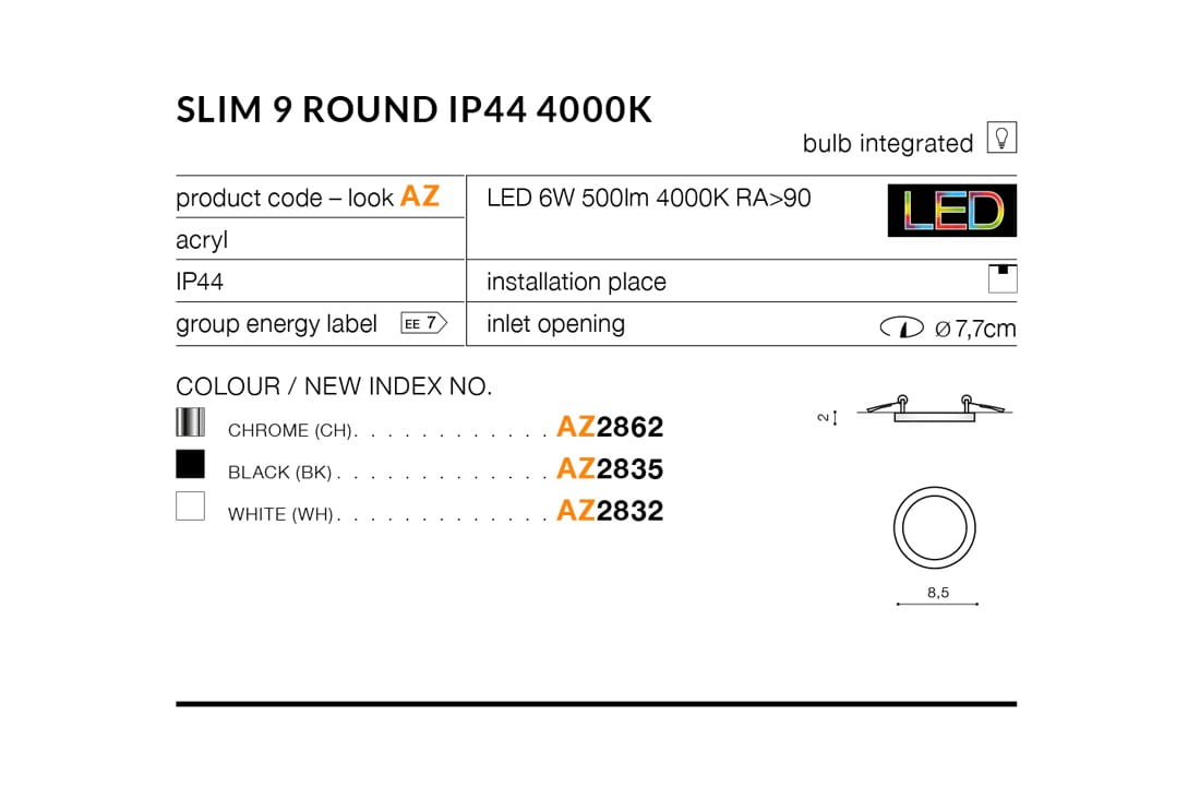== WYSYŁKA 48H== SLIM 9 ROUND CZARNY AZ2835 4000K 500lm LAMPA OCZKO WPUSZCZANE IP44 DO ŁAZIENKI AZZARDO