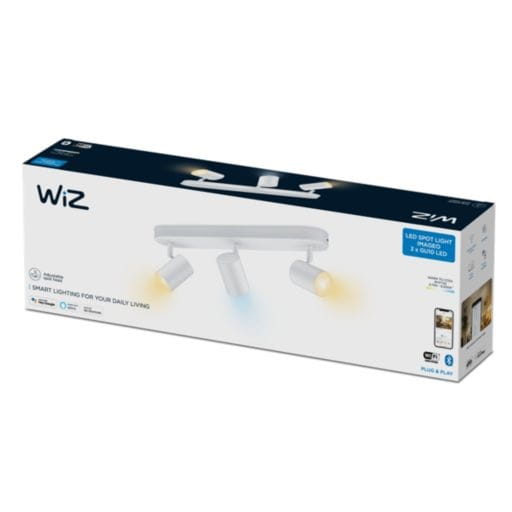 Inteligentny, wbudowany reflektor WiZ Imageo, zamknięty w eleganckiej i nowoczesnej białej oprawie, świeci trzema regulowanymi snopami światła w ciepłej lub chłodnej temperaturze barwowej bieli. Możesz nim sterować za pomocą aplikacji WiZ lub głosem w istniejącej sieci Wi-Fi