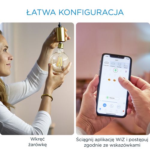 Zainstaluj oświetlenie stworzone z myślą o Twoim dobowym rytmie, dzięki inteligentnej żarówce kulistej WiZ LED G95 w stylu retro. Stosuj różne odcienie bieli od ciepłej do zimnej, by łatwiej się skoncentrować lub zrelaksować. Możesz ustawić harmonogram włączania i wyłączania świateł zgodnie z codzienną lub tygodniową rutyną, sterować oświetleniem za pomocą smartfona lub głosu, a także mieć zdalny dostęp do świateł nawet wtedy, gdy jesteś poza domem. Światła WiZ łączą się istniejącym routerem Wi-Fi i nie wymagają dodatkowego sprzętu.