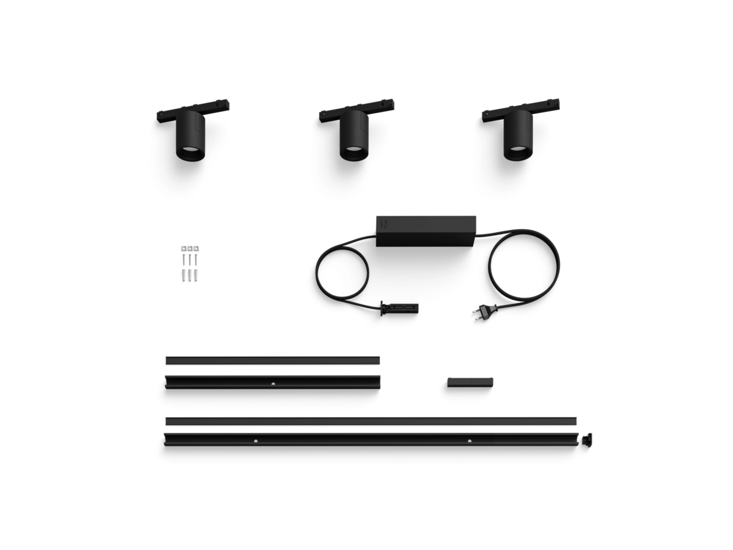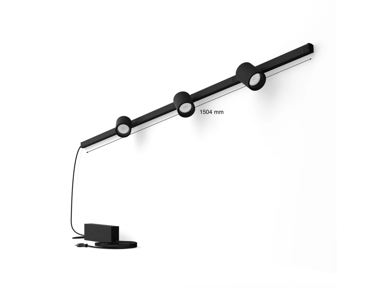 Zestaw ściennego oświetlenia szynowego w kolorze czarnym zawiera trzy cylindryczne reflektory, szynę o długości 1 metra, szynę o długości 0,5 metra, złącze proste i zasilacz umieszczony na końcu jednej szyny z wtyczką.