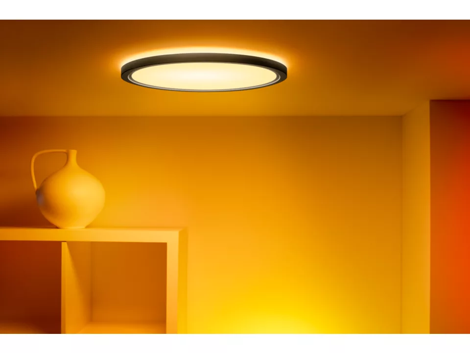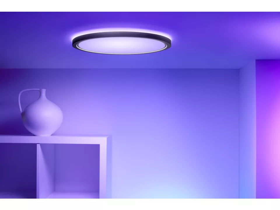 Superpłaskie eleganckie lampy sufitowe WiZ są super. Dynamiczne tryby światła w pełnej gamie kolorów cieszą zarówno podczas imprez, jak i spędzania wolnego czasu z bliskimi. Możesz też wybrać idealny odcień białego światła: chłodne światło dzienne sprzyjające koncentracji i produktywności, przytulne światło świec do relaksu lub dowolny odcień pośredni. Minimalistyczna czarna obudowa elegancko podkreśla wystrój. Ciesz się wszystkimi zaletami energooszczędnego oświetlenia LED bez odblasków, migotania i zmęczenia oczu, sterowanego przez Wi-Fi, oczywiście za pomocą aplikacji WiZ, pilota WiZ lub Twojego głosu.