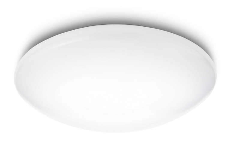 Prosty, stonowany kształt lampy ściennej i sufitowej LED Philips myLiving Suede jest subtelny i dyskretny, dzięki czemu pasuje do każdego pomieszczenia, gdzie tworzy krąg chłodnego, białego światła.