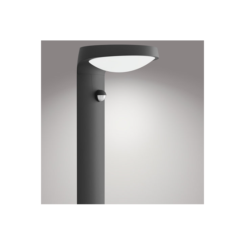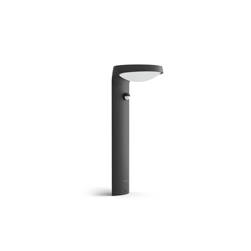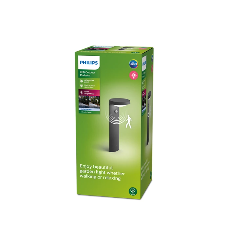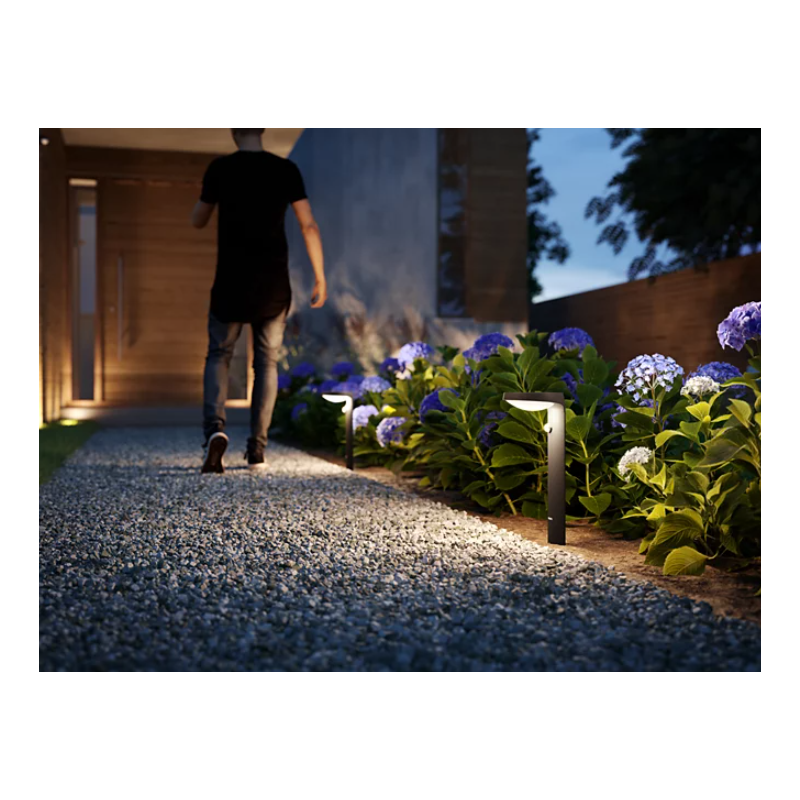 Lampa zewnętrzna LED Philips Tyla o kształcie słupka z ramkami w kolorze antracytowej szarości i w trwałej obudowie z odlewanego aluminium zapewnia przytulne światło. Tworzy atrakcyjny nastrój za pomocą chłodnego światła białego w stanie bezczynności i automatycznie rozjaśnia się, gdy w pobliżu znajdują się ludzie